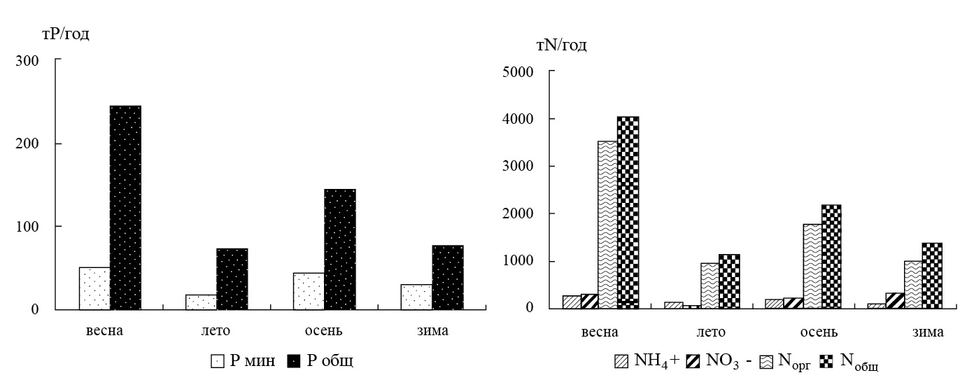 Максимальный речной сток Рмин, Робщ, аммонийного, нитритного, органического и общего азота наблюдался весной (36–49% от общего стока), немного меньше — осенью (25–31% от общего стока), минимальный — в периоды межени — зимой и летом (рис. 2). Исключением из общей картины был нитратный азот, максимальное поступление которого наблюдалось зимой (36% от годового стока), а наименьшее, как и по другим компонентам, — в период летней межени (рис. 2). Среди всех БЭ наименьший сток был отмечен для нитритного азота, в 2015–2016 гг. его поступление в Онежское озеро с речными водами составило 10.9 т/год.