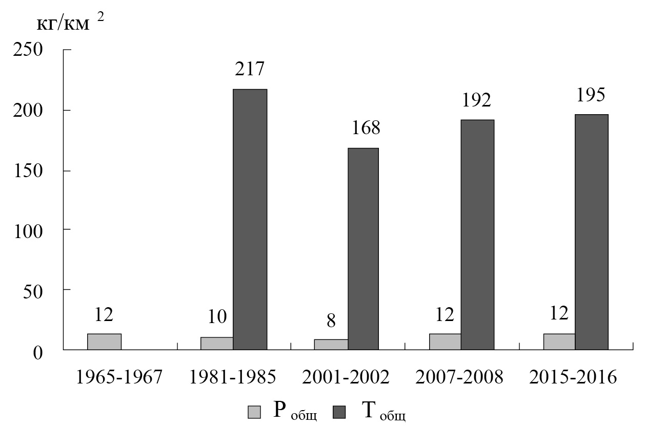 Удельный вынос БЭ с водосборной территории Онежского озера во временном аспекте несущественно изменяется (рис. 4). К 2001–2002 гг. происходит его снижение по обоим компонентам за счет уменьшения антропогенной нагрузки в результате экономического спада 1990-х гг., что согласуется с данными [23], затем величина удельного выноса увеличивается, его значение по Робщ достигает уровня 1965–1967 гг. (рис. 4).