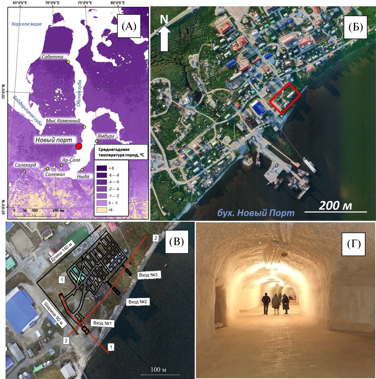 Рис. 1. А — Расположение поселка Новый порт на полуострове Ямал (с использованием материалов [21]). Б — Расположение мерзлотника в поселке Новый Порт. В — Положение и принципиальная схема тоннелей Новопортовского мерзлотника. Суммарная длина тоннелей — 1177 м. Вход № 2 и вход № 3 ликвидированы в связи с угрозой обрушения кровли. Красными линиями обозначены профили: 1–1 — поперечный, 2–2 — фронтальный. В подложке использован снимок, полученный авторами с использованием беспилотного летательного аппарата. Г — интерьер центральной галереи мерзлотника, высота потолка около 5 м. Высота потолка в боковом проходе — 1.5 м.