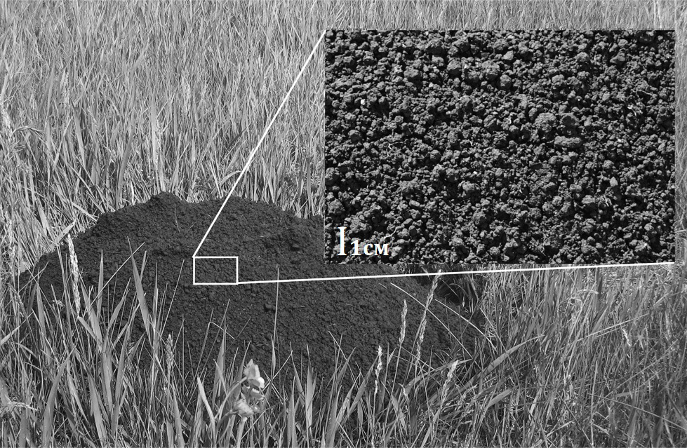 Важным методическим приемом поиска эталонно значимых черноземов явилось изучение морфологического строения верхней части их профилей в прикопках на этапе рекогносцировочных выездов на ключевые участки исследования. Выбирались места без заметных антропогенных нарушений поверхности почвы — за пределами зон проездов транспорта и когда-либо существовавших грунтовых дорог (что определялось натурными наблюдениями и анализом разновременных карт). Главным индикатором отсутствия распашки в прошлом являлась хорошо выраженная (зернистая или комковато-зернистая) структура черноземов в верхнем 20-см слое почв, а также отсутствие следов старопахотного горизонта, который долгое время (на протяжении многих десятилетий, а по мнению некоторых исследователей, даже столетий) может сохраняться в почвенных профилях [11, 12]. Как правило, еще до заложения прикопок идентифицировать структуру верхних почвенных слоев помогал анализ свежих выбросов почвенного материала слепышами, на поверхности холмиков которых зернистая структура естественных черноземов выглядела достаточно отчетливо (рис. 4).