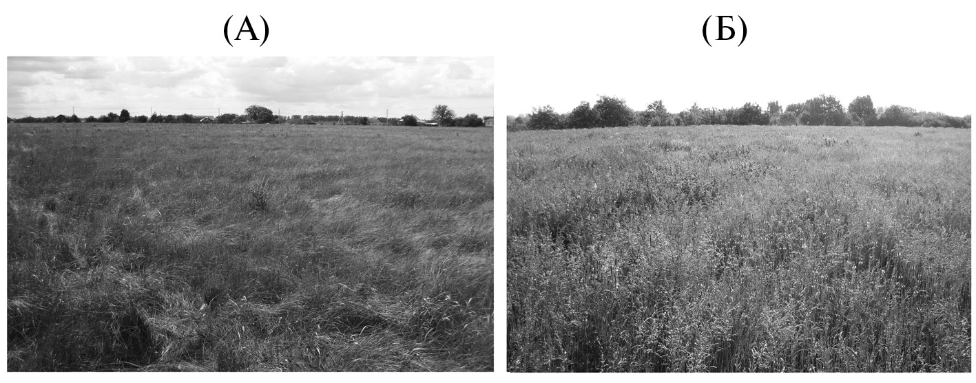 Рис. 5. Общий вид некосимого участка «Рождественка» (А) и косимого участка «Коровино» (Б). Фото в июне 2024 г.