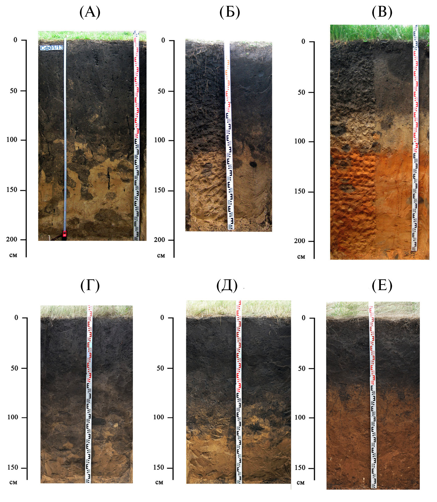 Рис. 6. Профили автоморфных черноземов сенокосов–выгонов, изученных на юге лесостепи Среднерусской возвышенности (названия участков приводятся в соответствии с рис. 1): А — чернозем типичный на лессовидном карбонатном тяжелом суглинке (участок “Сафоновка”); Б — чернозем типичный на лессовидной карбонатной глине (участок “Юрьевка”); В — чернозем выщелоченный на маломощном лессовидном карбонатном среднем суглинке, подстилаемом неогеновыми опесчаненными суглинками; Г — чернозем типичный на лессовидном карбонатном среднем суглинке (участок “Коровино”); Д — чернозем выщелоченный на лессовидном карбонатном тяжелом суглинке (участок “Коровино”); Е — чернозем выщелоченный на красно-бурой глине (участок “Триречное”).