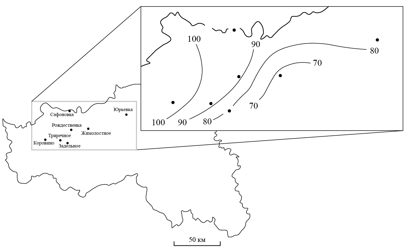 Рис. 7. Изолинейное распределение мощности (см) гумусированной части профилей эталонно значимых черноземов, изученных на 7 ключевых участках сенокосов — выгонов в лесостепной части Белгородской области (юг Среднерусской возвышенности).