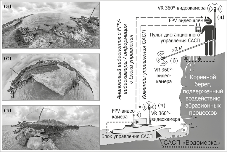 Наиболее оптимальной на данной локации представлялась съемка в пешем ходу со стороны моря, от которой пришлось отказаться из соображений безопасности. Поэтому сбор видеоинформации был произведен альтернативными способами: статичным с берега (рис. 1a, б) при помощи компактной цифровой VR 360°-видеокамеры Insta360 One X, закрепленной на моноштативе, и динамическим (рис. 1в) — с помощью надводного беспилотника “Водомерка”, оснащенного аналогичным съемочным оборудованием. В результате удалось зафиксировать со всех ракурсов не только последствия абразионного разрушения берега, но и ряд процессов, влияющих на его интенсивность, вызванных как природными, так и антропогенными факторами.