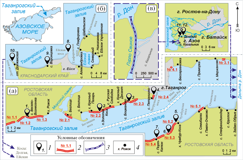 3. Fig. 2. Layout of individual locations and coastal areas for which multi-temporal panoramic video retrospectives and continuous dynamic VR 360° video images were developed, illustrating the consequences of hazardous coastal processes: (a) — coastal zone of the Taganrog Bay within the Rostov Region; (b) — coastal zone of the Taganrog Bay within the Krasnodar Region; (c) — Don River delta. 1 — locations of the coastal zone of the Taganrog Bay and the Don River delta, to which panoramic video retrospectives were developed; 2 — areas of the coastal zone of Taganrog Bay with an average annual abrasion rate of more than 1 m/year; 3 — section of the Svinoye girlo; 4 — rural settlements.