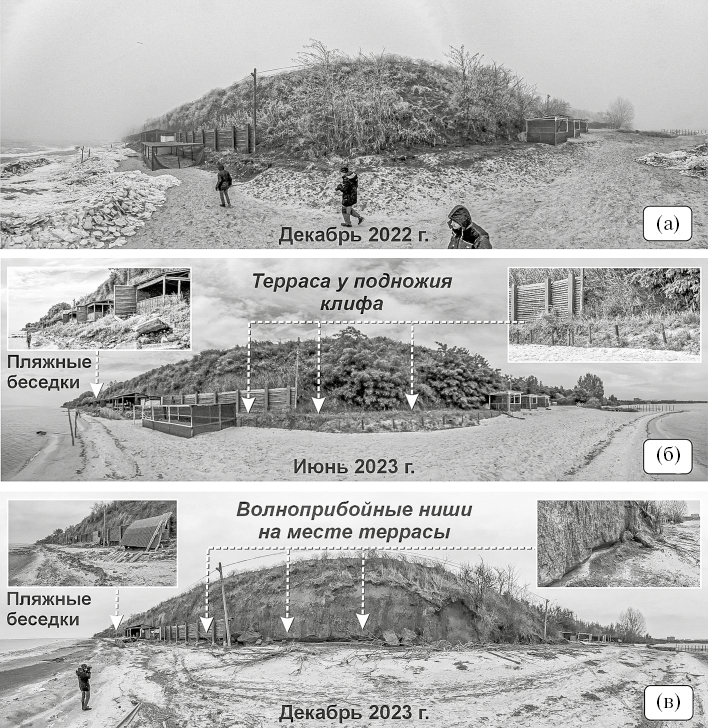 4. Fig. 3. Screen shots of a panoramic video retrospective illustrating the annual dynamics of the abrasive destruction of the shore section in the village of Petrushino: (a, b) — 12/24/2022 and 06/02/2023 — the cliff is blackened, the shore is not subject to active abrasion, the presence of a terrace at the foot of the cliff; (c) — 12/06/2023 — significant destruction of the shore with the formation of wave-piercing niches, The terrace at the foot of the cliff was completely eroded by the storm surge on 26-27.11.2023, and most of the beach gazebos were also destroyed.