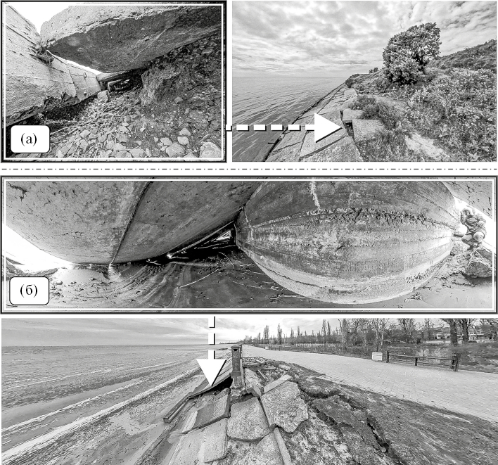 В процессе рекогносцировочного обследования берегов залива в 2023 г. метод панорамного видеодокументирования также применялся для сбора визуальных данных о состоянии отдельных типов конструкций берегоукрепительных сооружений. С помощью закрепленной на моноштативе экшен-камеры Insta360 One X3, передающей потоковое цифровое сферическое видеоизображение в режиме реального времени через Wi-Fi соединение, удалось обследовать и видеодокументировать образовавшиеся полости в сооружениях (откосах) из железобетонных плит и блоков, защищающих морские берега в г. Таганроге и с. Петрушино Ростовской области (рис. 4).