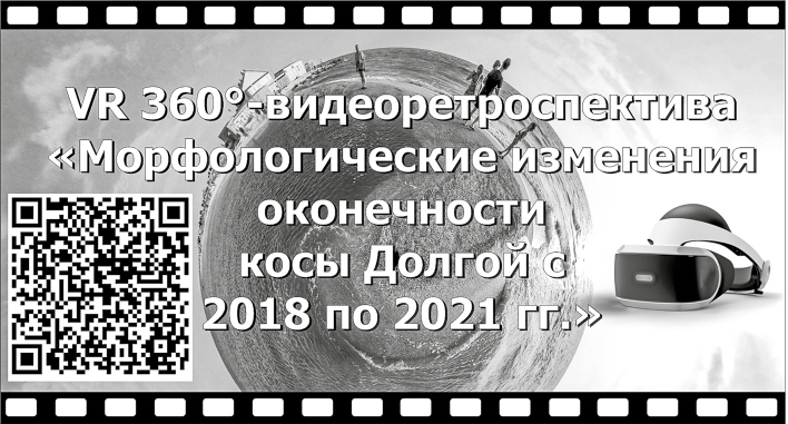 Рис. 5. Пример панорамной видеоретроспективы, иллюстрирующей морфологические изменения оконечности косы Долгой в период с 2018 по 2021 г. (со сферическим видеороликом можно ознакомиться, отсканировав QR-код).