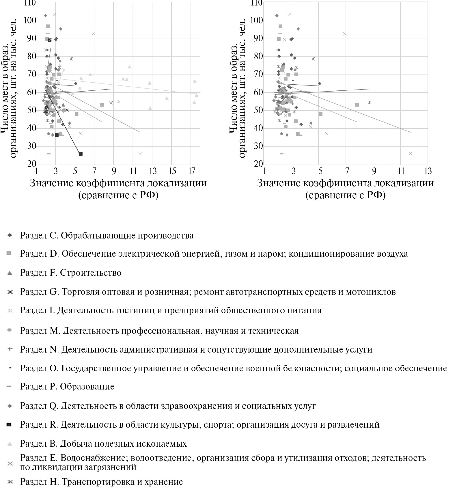 Fig. 5. Correlation between the localization coefficient indicators by industry of specialization and the number of places in educational organizations.