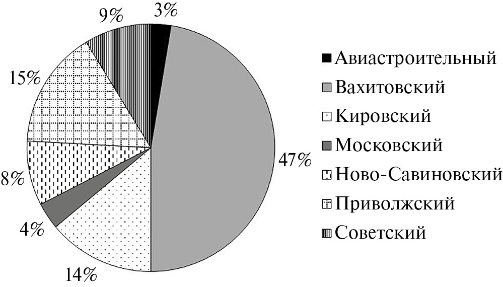 Территория города Казани разделена на 7 административных районов: Авиастроительный, Московский, Ново-Савиновский, Кировский, Советский, Приволжский и Вахитовский. Следует отметить, что ни численность населения района, ни его площадь не определяют количество объектов подземной инфраструктуры (см. табл. 2). Так, площадь Вахитовского района в 4.5 раза меньше территории Приволжского района, однако количество подземных объектов в нем в 3 раза больше (см. рис. 1).