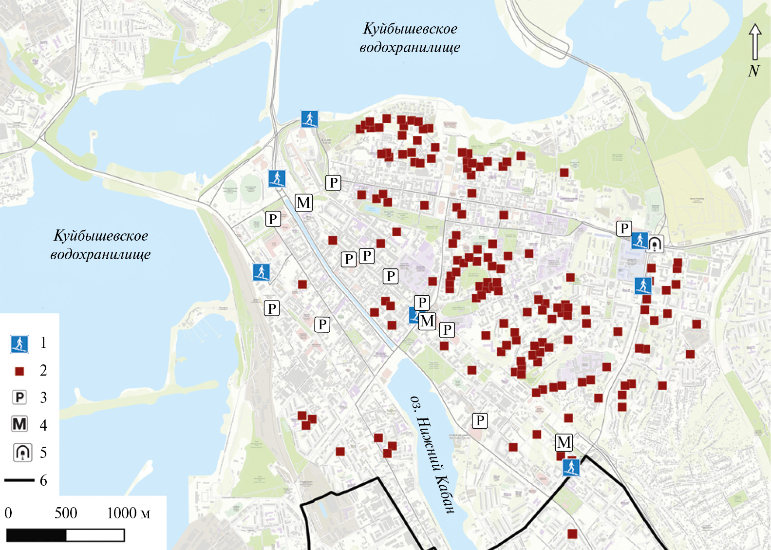 Рис. 3. Объекты подземной инфраструктуры Вахитовского района: 1 — подземные пешеходные переходы; 2 — подземные парковки в жилых многоквартирных домах; 3 — подземные парковки при объектах социального обслуживания; 4 — станции метрополитена; 5 — тоннели; 6 — граница района.