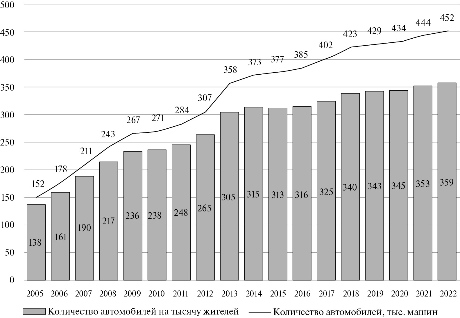 Рис. 4. Уровень автомобилизации в городе Казани за период 2005–2022 гг.
