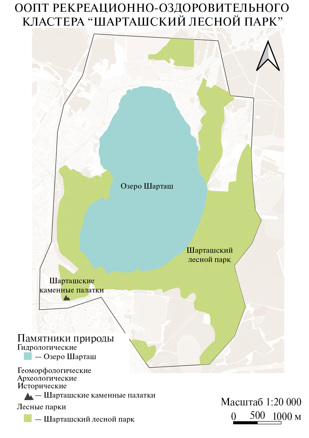 Рекреационно-оздоровительный кластер “Шарташский лесной парк” включает три особо охраняемых природных территории (ООПТ) областного значения: памятники природы “Шарташские каменные палатки” и “Озеро Шарташ”, а также лесной парк “Шарташский” (см. рис. 1). Все особо охраняемые природные территории относятся к рекреационно-туристским аттракциям, активно посещаются жителями Екатеринбурга и требуют сохранения особого режима использования при включении в кластер.