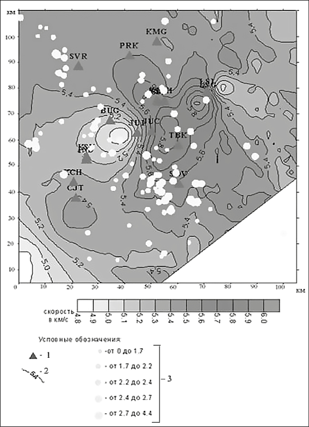 Рис. 1. Скоростное строение среды на глубинах 0-7 км. 1 – пункты наблюдения, 2 – изолинии скорости, 3 – эпицентры местных землетрясений с магнитудами М=0-4.4.