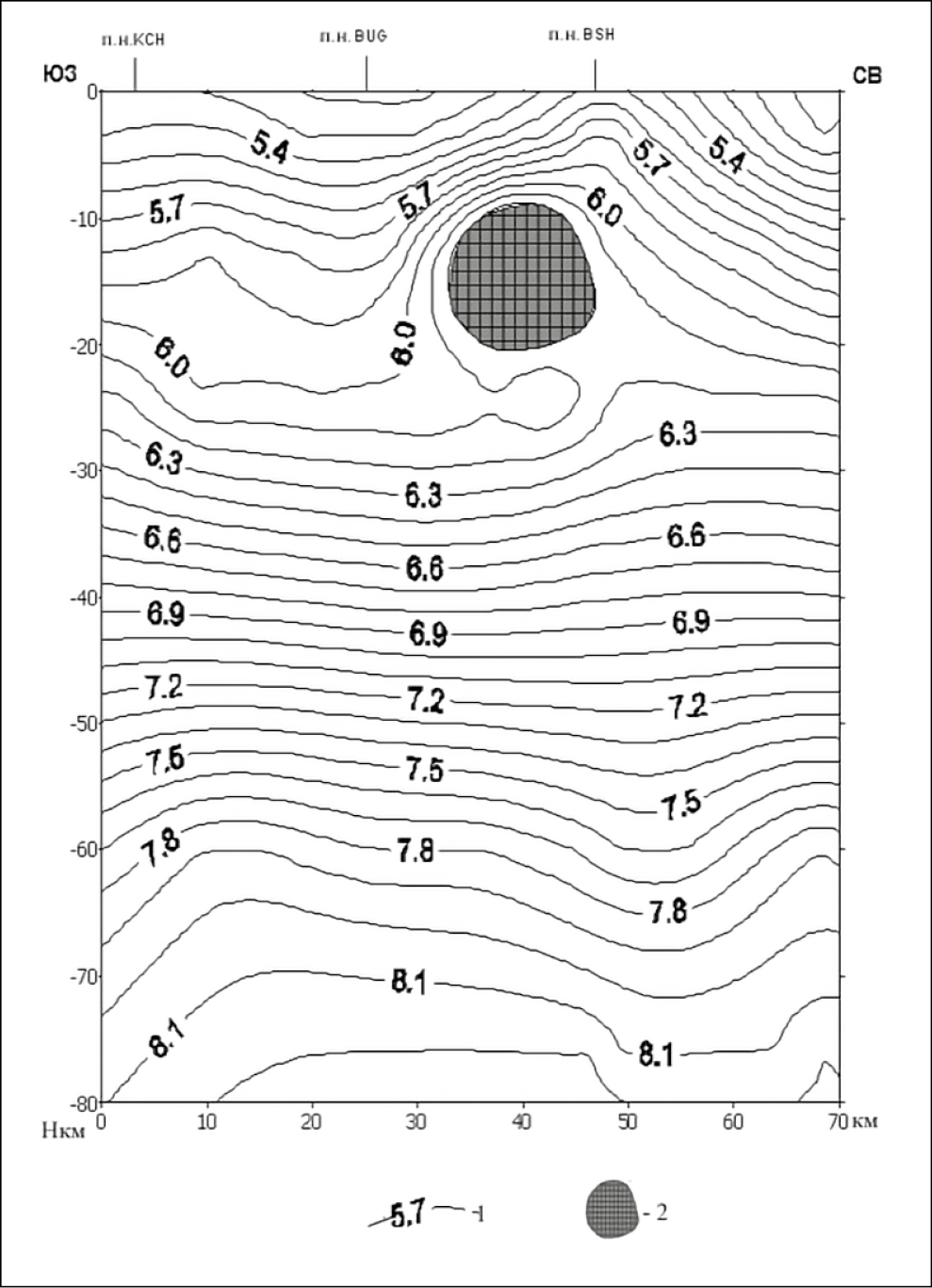 Рис. 2. Скоростной разрез в крест простирания высокоскоростной структуры. 1 – изолинии скорости, 2 – высокоскоростное ядро.