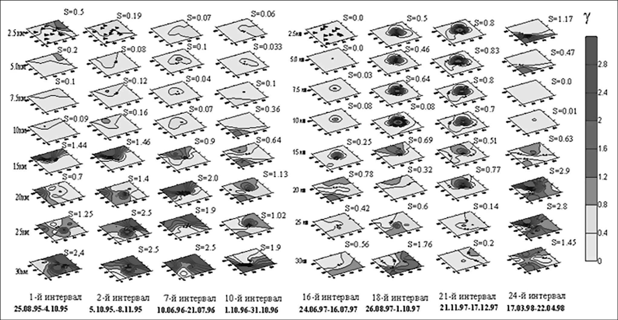 Для каждого пункта наблюдения исследуемого региона по энергии проходящих обменных волн далеких землетрясений (PS) рассчитывалось значение показателя анизотропности γ [9] (не следует путать с коэффициентом анизотропии χ [14]) в выбранном интервале глубин и строились схемы его распределения, соответствующие определенным диапазонам глубин для разных интервалов времени наблюдения. Далее по специальной формуле [9] оценивался интегральный показатель напряженного состояния среды S для каждой схемы. В результате получались зависимости изменения показателя S во времени и по глубине, а также набор схем распределения показателя γ для различных диапазонов глубин и разных интервалов времени.