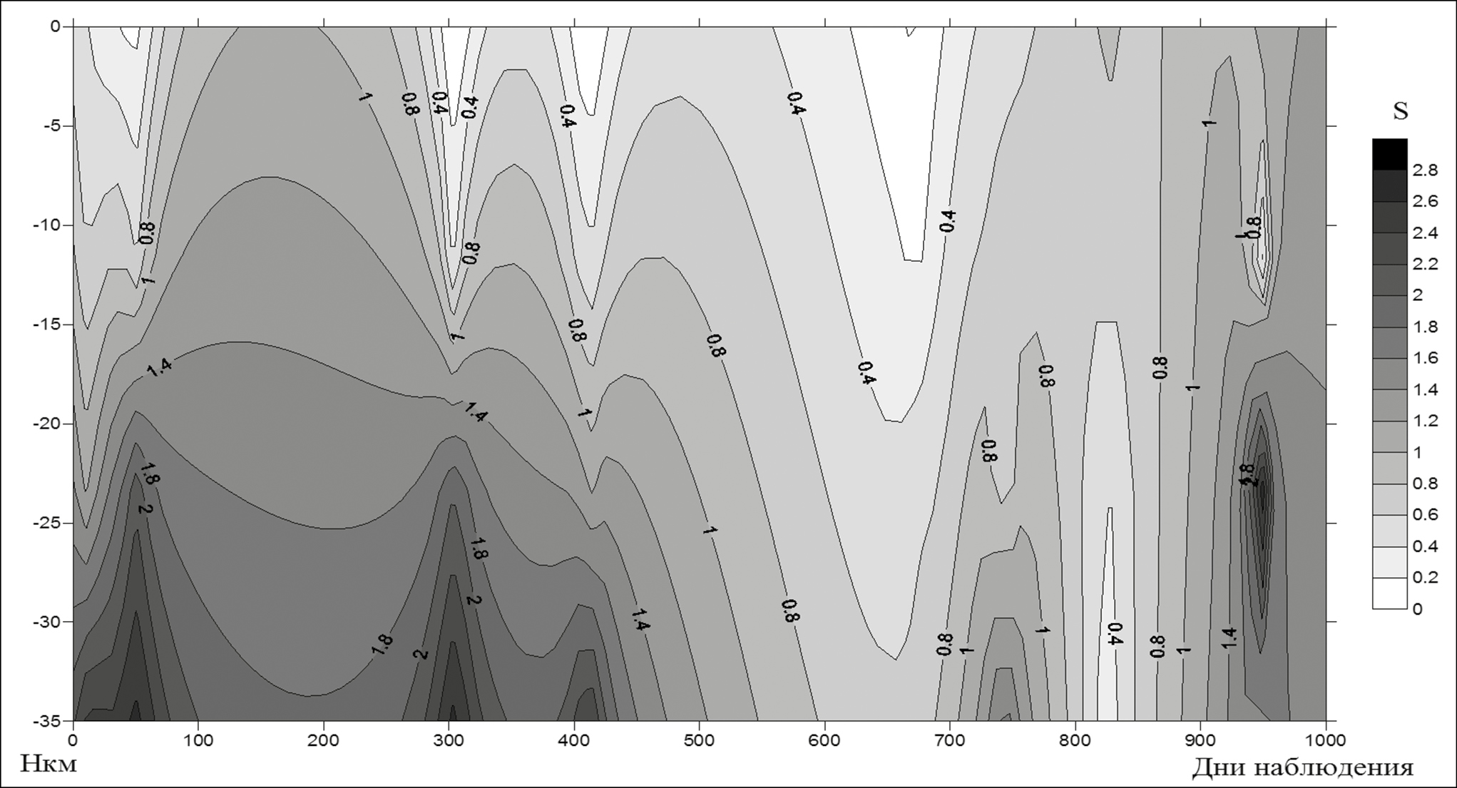 Для каждого интервала наблюдения для всех схем распределения показателя γ, соответствующих разным глубинным уровням, был рассчитан показатель напряженного состояния S, и построена зависимость изменения этого параметра по глубине и во времени (рис. 4). Из рисунка видна цикличность в изменении напряженного состояния во времени на всех глубинах. Выделяется временной блок (до 500 сут), когда среда находилась в напряженном состоянии. Причем напряжение распространялось снизу вверх. В период 500-700 сут наблюдения в среде напряженность отсутствовала, ослабление напряжения распространялось сверху вниз. В последующий временной интервал напряженное состояние среды вновь нарастало, и повышенное напряженное состояние стало характерным для всего разреза.