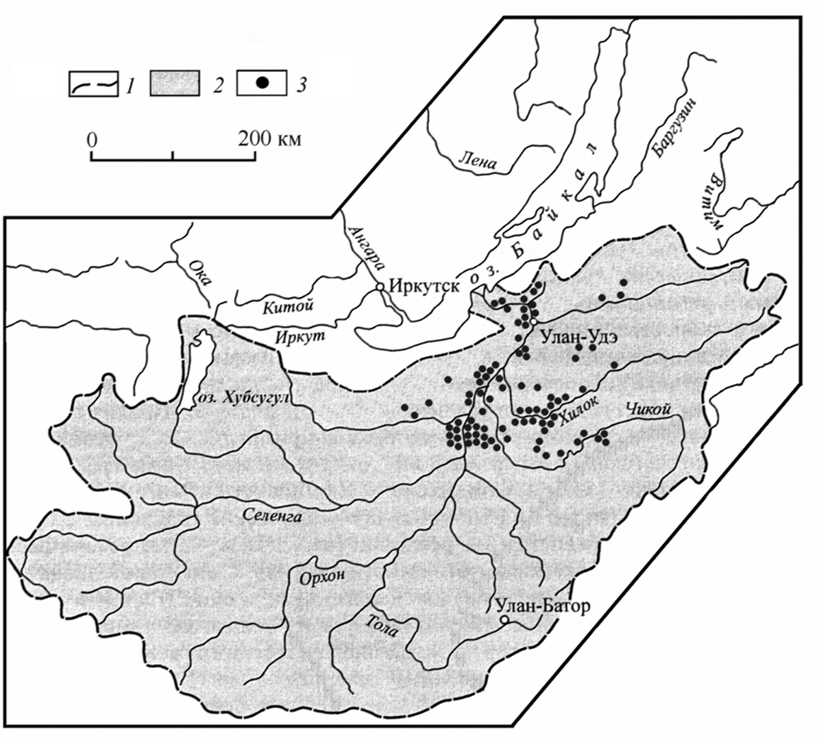 Рис. 1. Схема распространения палеолитических стоянок в бассейне р. Селенги в палеолите (Западное Забайкалье): 1 – граница водосбора, 2 – бассейн р. Селенги, 3 – стоянки и поселения.