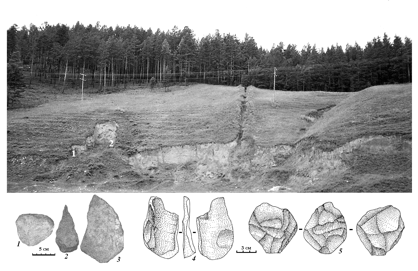 Климат был довольно холодным, январские температуры опускались до минус 15-20°С, среднегодовые осадки составляли 300-400 мм [3]. Основанием вероятного обитания человека в Юго-Восточном Прибайкалье около 1 млн лет назад стали артефакты из третьей толщи Засухино (рис. 2, 1-3), “свидетельствующие о присутствии человека в довольно раннее время (от 200-500 до 700-900 тыс. л. н.)” [22, с. 61]. Однако “большая часть материалов дискуссионна, не подтверждена …данными абсолютного датирования», в «основу выделения среднепалеолитической стадии положен технико-морфологический принцип оценки артефактов”. При этом отмечается, что “ежегодно возрастает объем новой информации, и сторонники отрицательной оценки материалов забайкальских коллекций как свидетельств ранних этапов (нижнего и среднего палеолита)” теряют свои позиции. Трудно согласиться с этой точкой зрения, основанной только на технико-морфологической оценке артефактов. Но, приняв ее во внимание, можно предположить, что древнего человека в Итанцинской впадине окружал растительный покров с типичными для конца неогена широколиственными формами (липа, вяз, дуб, граб, клен, орех, лещина) [15]. В отличие от плиоцена, когда они входили в состав темнохвойных лесов, эти формы в то время стали элементами придолинных и низкогорных смешанных светлохвойных лесов.