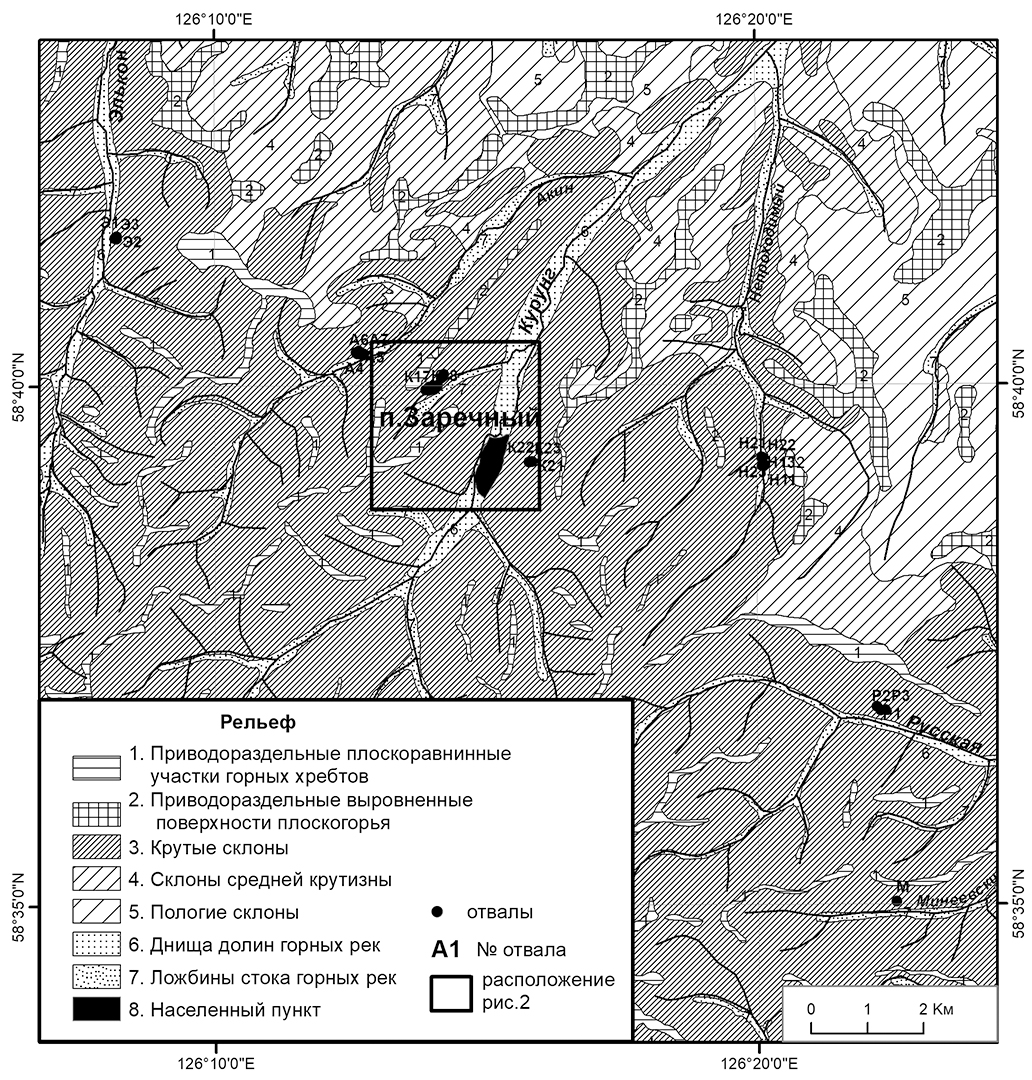 Рис. 1. Размещение радиоактивных отвалов горных пород зоны Южная в Эльконском ураново-рудном районе на территории Южной Якутии.