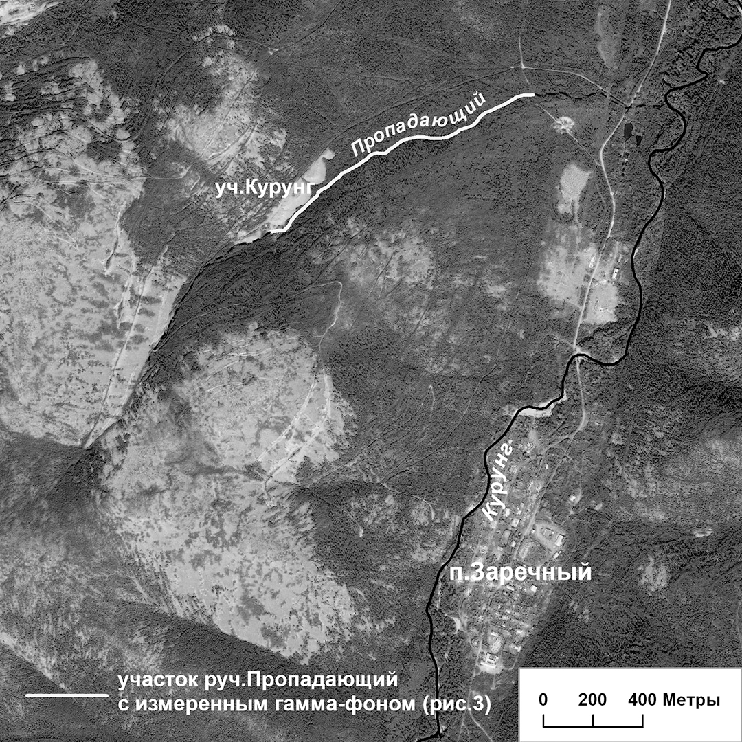 Как видно на всем обследованном авторами 1.5 км отрезке руч. Пропадающего вплоть до его устья фиксируется влияние техногенного загрязнения, и концентрации радионуклидов здесь все еще не соответствуют их фоновому уровню (см. табл. 5). Последнее также подтверждается замерами гамма-фона, проведенными вдоль русла ручья (рис. 3). Здесь водное рассеяние радионуклидов хорошо фиксируется гамма-съемкой на низкой пойме и в русле ручья на удалении от отвалов вплоть до 2 км.