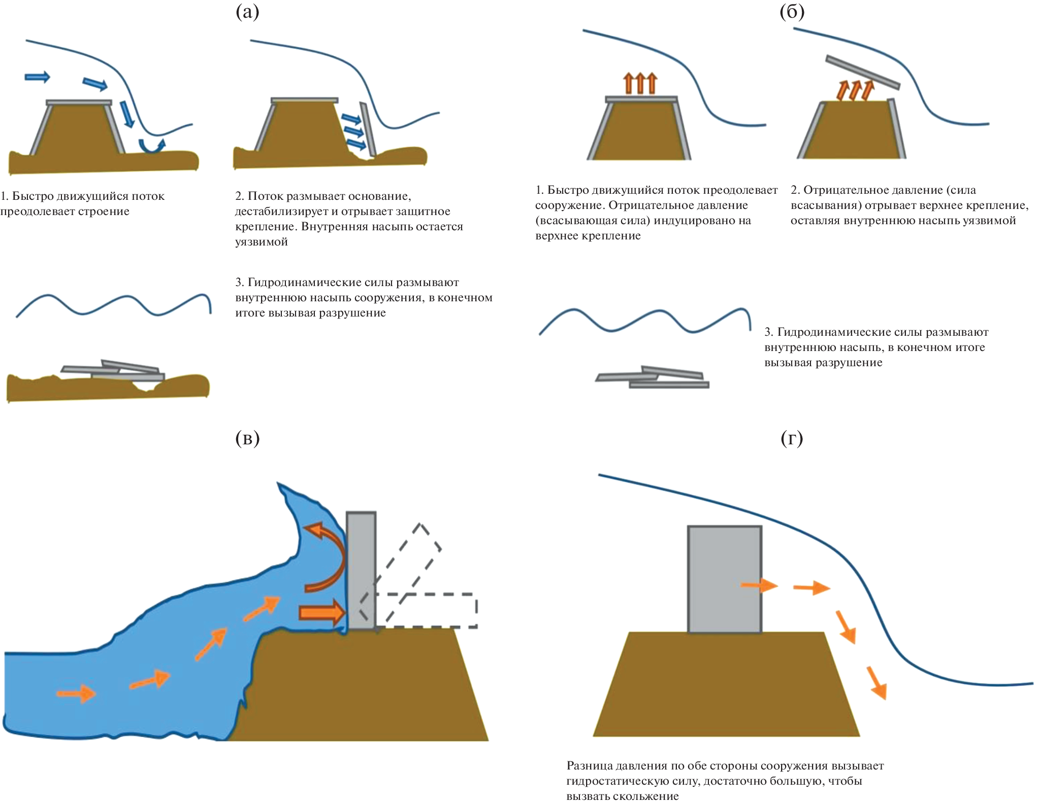The effects of sea waves and currents on harbour hydraulic structures are analysed from published open source data and the characteristics of scour from waves, including tsunami waves, are considered. Local bottom scour threatening the general stability of gravity-type engineering structures can arise under the effect of storm waves and currents, jets from ship propulsion devices and tsunami waves near hydraulic engineering structures. The types of scour mechanisms from sea waves have been investigated, i.e., local, general, and overtopping scour. There is a lack of sufficient measurement data for general scour to verify the calculation methods. Generally, general scour does not damage a structure, although it can contribute to its destruction by other types of scour when they overlap. Therefore, existing studies mainly focus on the analysis of local scour. The relationship between local scour and ground liquefaction and their influence on the stability of marine hydraulic structures is established. Failure mechanisms of hydraulic structures due to erosion by tsunami waves are analyzed: leeward and seaward toe scour, crown armour failure, parapet wall failure, sliding failure. The tsunami wave scour enhancement parameter is given, which is the fraction by which the pore pressure gradient reduces the frictional forces resisting scour. Significant ground instability occurs when the scour amplification parameter Λ exceeds a value of 0.5 (Λ ≥ 0.5). The parameter Λ can be used to assess areas where instantaneous liquefaction may be responsible for scour and sediment movement and to further recalculate erosion depths obtained without considering liquefaction. Liquefaction from a tsunami wave may penetrate up to 28% of the maximum erosion depth due to shear forces. The liquefaction phenomenon may occur due to a sudden drop in the water level in the area of return flow concentration. Consequently, the liquefaction phenomenon must be considered in the stability and erosion analysis around the structure.