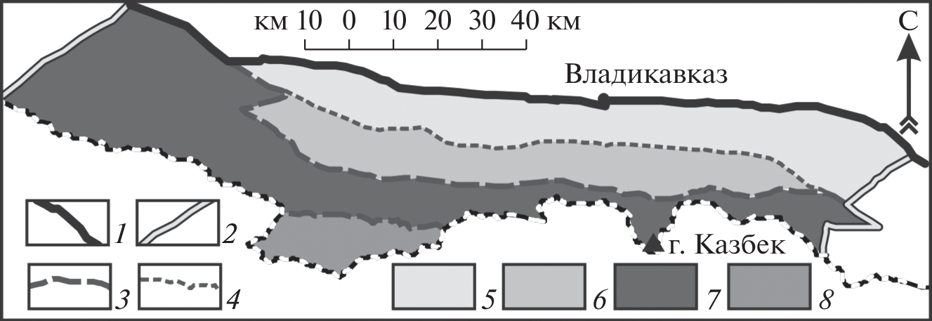 Казбекский семент отличается от смежных Центрального и Восточного сегментов мегасвода Большого Кавказа относительной суженностью основных зон и их широтной ориентировкой. Основные элементы сегмента – зоны Центральных поднятий, Северного и Южного крыльев. Зона Северного крыла делится на Внешнюю и Внутреннюю подзоны. Внешняя подзона Северного крыла включает: Алагир-Владикавказскую краевую цепь структурных ступеней, Дзагарисскую гряду поднятий, Тарскую наложенную впадину, Редантскую цепь грабенов, Фетхузскую гряду поднятий, Балтинский грабен и Восточную группу поперечных структурных ступеней. Во Внутреннюю подзону входят Гряда поднятий Скалистого хребта и Садонская шовная зона. Зона Центральных поднятий включает: Балкарскую группу блоков, грабен Верхнеурухской шовной зоны и Цея-Казбекское поднятие, к востоку от которого располагается Хевсуретская краевая седловина. К расположенной в пределах России части Зоны Южного крыла мегасвода относятся Мамисонская система прогибов и Рокская гряда поднятий. Применение оротектонического метода позволило выделить в пределах перечисленных региональных структур локальные структуры, большинство из которых разделены сбросами. Выделено три региональных шовных зоны. На севере Казбекского сегмента протягивается широкая и сложно построенная зона Владикавказского глубинного разлома. На южной границе Северного крыла расположена Садонская шовно-депрессионная зона с крупными надвигами в северном крыле. Западная часть Зоны Центральных поднятий пересекается Верхнеурухской шовно-депрессионной зоной, которая ответвляется от Садонской зоны. Полученные оригинальные данные, отсутствующие в стандартных материалах по геологической съемке, полезны для строительного проектирования и геоэкологии.