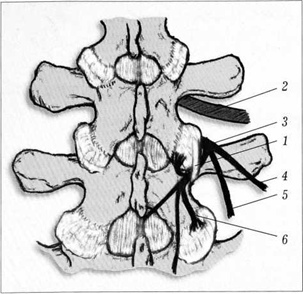 Межпозвонковый, фасеточный, или дугоотростчатый, сустав (art. zygapophyseales) образуется верхним и нижним суставными отростками и окружен суставной капсулой, которая прикрепляется по краю суставного хряща. Дугоотростчатый сустав иннервируется медиальными веточками задней (дорсальной) ветви спинномозгового нерва. Каждая медиальная веточка направляется вокруг основания верхнего суставного отростка и проходит через углубление, образованное lig. mamilloaccessorius. В этом месте отходят маленькие веточки нерва к капсуле фасеточного сустава. Медиальная нисходящая веточка идет каудальнее и, разделяясь на несколько частей, иннервирует мышцы, связки и частично нижележащий межпозвонковый сустав [2, 3, 5, 21] (рис. 1). Таким образом, иннервация каждого дугоотростчатого сустава осуществляется по меньшей мере с двух уровней (по некоторым данным — с трех). Например, дугоотростчатый сустав L4-5 иннервируется из корешковых нервов уровней L3 и L4 (возможно, L2).