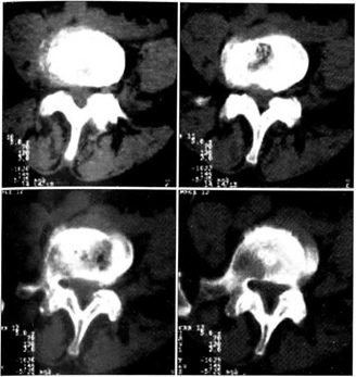 Всем больным проводилось лучевое обследование, включавшее рентгенографию позвоночника в двух проекциях (при поясничной боли дополнительно выполнялись функциональные пробы), в сомнительных случаях для исключения дискорадикулярного конфликта назначалась магнитно-резонансная или компьютерная (предпочтительнее) томография пораженного отдела (рис. 2). У 13 больных была выявлена нестабильность сегментов L5~S1 и L4-5. На основании результатов клинического и рентгенологического обследования установлено, что причиной болевого синдрома у рассматриваемой группы пациентов являлись дегенеративные изменения в межпозвонковых суставах, т.е. диагноз формулировался как спондилоартроз определенных сегментов (в грудном отделе чаще были поражены сегменты от ТЗ до Т12, в поясничном отделе — L3-4, L4~5, L5-S1).