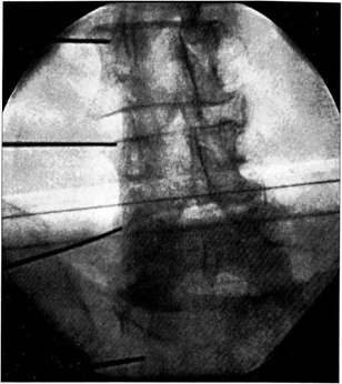 Манипуляция выполнялась в операционной в амбулаторных условиях. В положении больного на животе под местной анестезией (10 мл 2% раствора лидокаина) под контролем электронно-оптического преобразователя производили пункцию параартикулярной области в зоне расположения нервов, идущих к суставной капсуле. Как правило, одномоментно выполняли пункцию на трех—четырех уровнях с одной стороны. В 2 случаях в связи с тяжестью заболевания пункция проводилась с обеих сторон. Положение иглы контролировали в двух проекциях. Затем с помощью радиочастотного генератора RFG-3C PLUS фирмы «Radionics» осуществляли электростимуляцию фасеточных нервов с частотой 50 и 2 Гц. Наличие болевой реакции считали критерием корректного положения иглы (рис. 3).