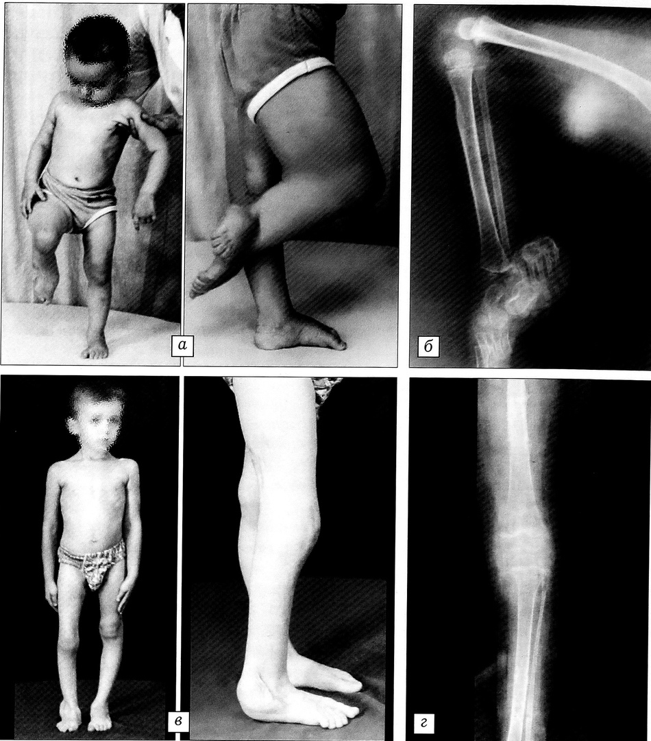 Больной М. 3 лет. Врожденный порок развития костей правой голени в сочетании с подколенным птеригиумом. a — внешний вид при поступлении; б в — внешний вид после завершения лечения: деформации опорна; г — рентгенограмма оперированной конечности.