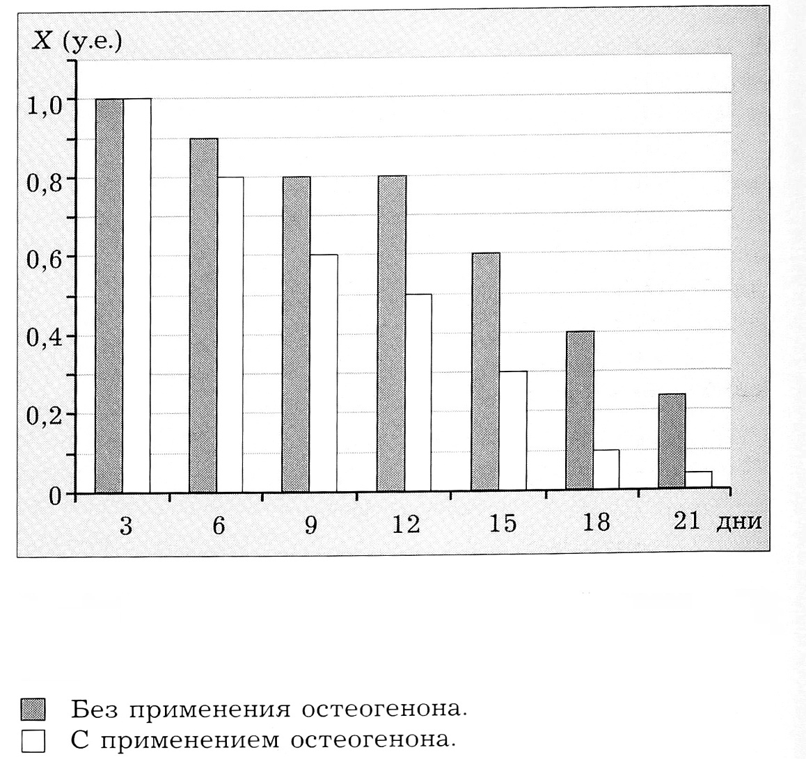 Рис. 1. Динамика клинических проявлений перелома (X) при лечении без применения и с применением остеогенона