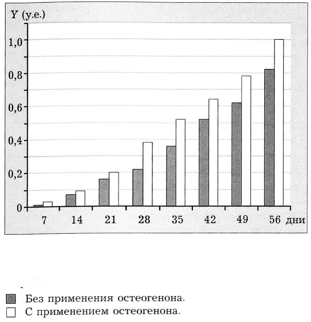 Рис. 2. Динамика рентгенологических проявлений консолидации отломков (Y) при лечении без применения и с применением остеогенона