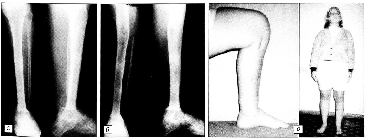 Рис. 2. Больная Е. Полное отчленение сегмента нижней конечности. а-рентгенограммы через 1 год после реплантации отчлененного сегмента (укорочение конечности на 11 см); б — рентгенограмма, в — внешний вид и функция конечности через 3 года после реплантации и 2 года после начала удлинения голени.