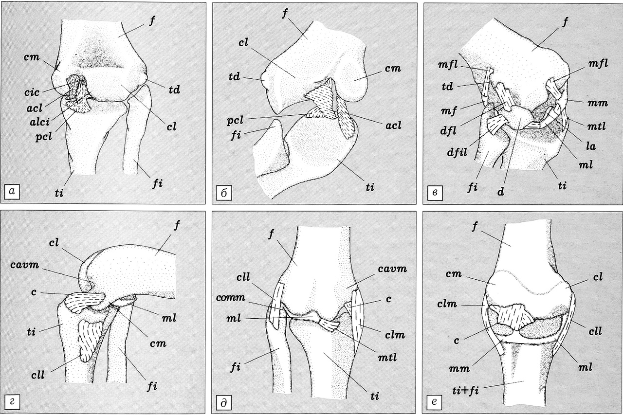 Рис. 1. Строение коленного сустава у четвероногих с латеральными конечностями.a-e — Gekko gecko: а — крестообразные связки (кости бедра и голени в нормальном положении), вид сзади; б — крестообразные связки (бедренная кость развернута по часовой стрелке для лучшей демонстрации области прикрепления связок), вид с латеральной стороны и спереди; в — мениски, вид с латеральной стороны и спереди;г, д — Chrysemys scripta: г — крестообразная связка коленного сустава, вид с медиальной стороны; д —мениск, вид спереди;е — Rana catesbeiana: крестообразная связка и мениски, вид сзади.acl — передняя крестообразная связка; alci — крыло, прикрывающее интеркондилярную полость; cavm — медиальная полость; cic — интеркондилярная полость; cl — латеральный мыщелок; с - крестообразная связка; сП — латеральная коллатеральная связка; elm — медиальная коллатеральная связка; ст — медиальный мыщелок; сотт — хрящевая перемычка; d — диск; dfil — дискофибулярная связка; dfl — дискофеморальная связка; f — бедренная кость; fi — малоберцовая кость; 1а — передняя лунула латерального мениска; mf — феморофибиальный мениск; mfl — менискофеморальная связка; ml — латеральный мениск; тт — медиальный мениск; mtl — мениско- тибиальная связка; pci — задняя крестообразная связка; td — бугорок для сочленения с диском; ti — большеберцоая кость; ti+fi — сложная берцовая кость.