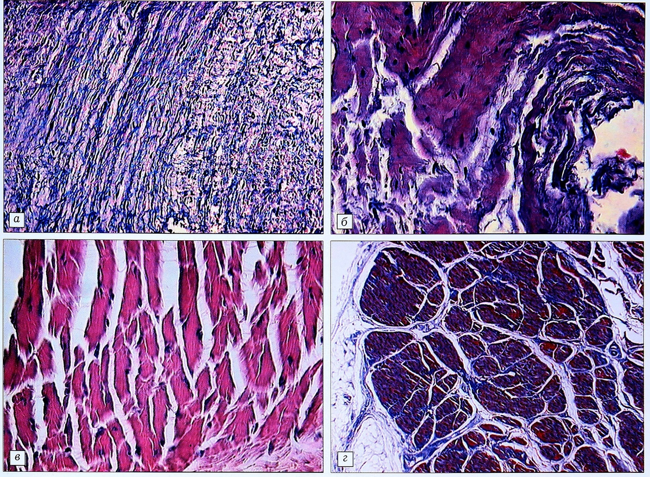 Рис. 2. Гистология крестообразных связок коленного сустава (окраска по Маллори).a — Rana catesbeiana (ув. 40); б — Chrysemys scripta (ув. 40); в — Gekko gecko (ув. 40); г — Homo sapiens (ув. 20).