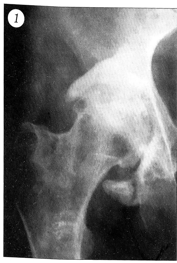 При прогрессировании процесса рентгенологическое обследование выявляет грубую деформацию вертлужной впадины, нарушение ее пространственной ориентации. Головка бедренной кости находится глубоко во впадине. Суставная щель резко сужена или отсутствует вследствие разрушения и дегенерации покровного хряща сочленяющихся поверхностей. Структура головки бедренной кости характеризуется склерозированием ее по сегментарному или тотальному типу. Со стороны краев вертлужной впадины формируются костно-хрящевые выросты треугольной формы, которые наподобие панциря покрывают шейку бедра, приближаясь к основанию большого вертела. Отчетливо определяется нижний край вертлужной впадины, который окружает головку бедра снизу, переходя на шейку (рис. 1).