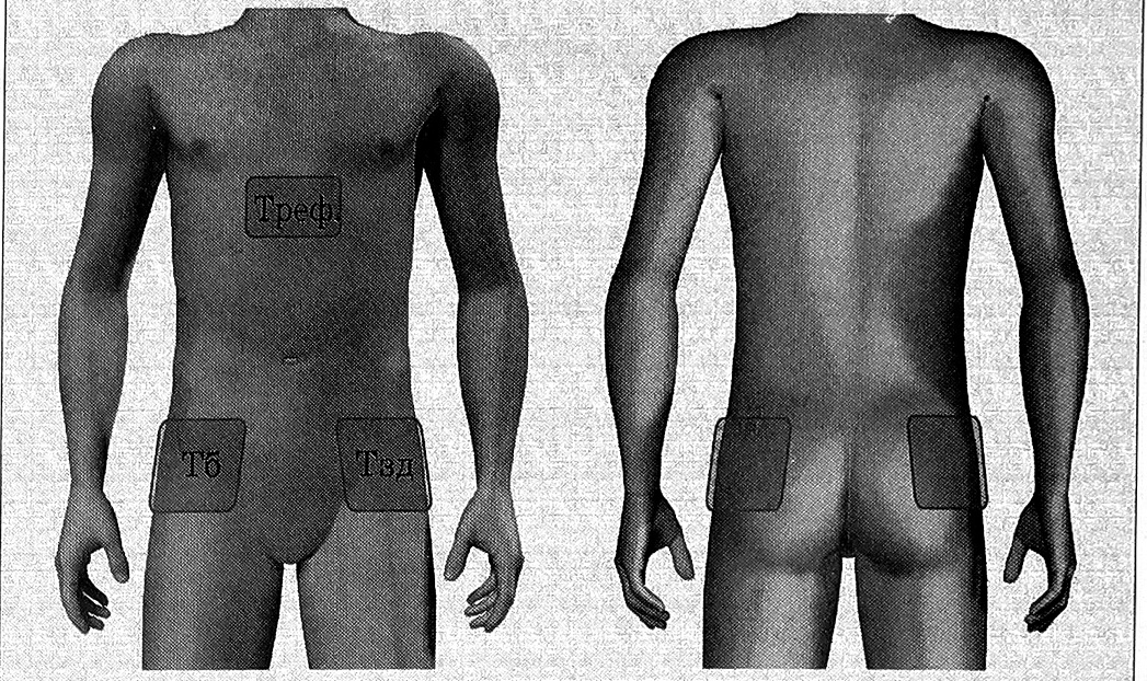 Схема зон измерения температуры в передней и задней проекциях представлена на рис. 1. Оценивали усредненную температуру каждой зоны измерения — референтной (Треф.), зоны на больной (Тб) и на здоровой (Тзд) стороне (в градусах Цельсия), после чего рассчитывали дифференциальные температуры: Т1 = Треф.-Тб; Т2 = Треф.-Тзд; АТ = Т2-Т1. Кроме того, определяли площадь зоны нарушения термотопографии бедра — S (в квадратных сантиметрах) на экране монитора ТС-800 в виде разницы с контралатеральной конечностью.