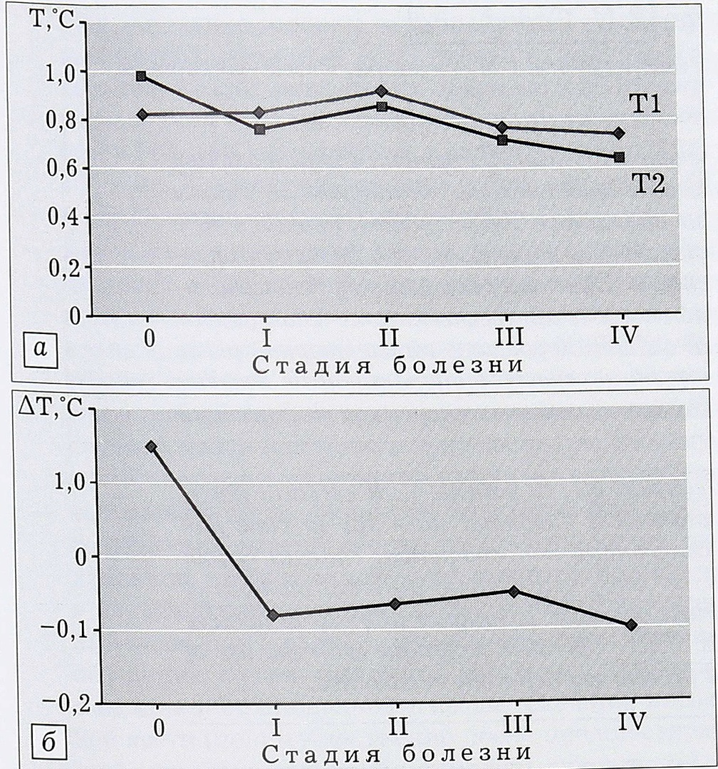 Рис. 2. Динамика усредненных величин Tl, Т2 (а) и ДТ (б) в зависимости от стадии болезни Пертеса.