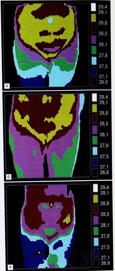 Термотопографию изучали с помощью термографа AGA-780 (Швеция) с компьютерной приставкой ТС-800 для количественной обработки термоизображений, позволяющей измерять градиент температуры 0,ГС и более. Исследования проводили при температуре окружающей среды 20-22°С в стандартном вертикальном положении больного после 15-минутного отдыха. Соблюдение одинакового расстояния до камеры тепловизора обеспечивало сопоставимость площадей изображений на экране мониторов.