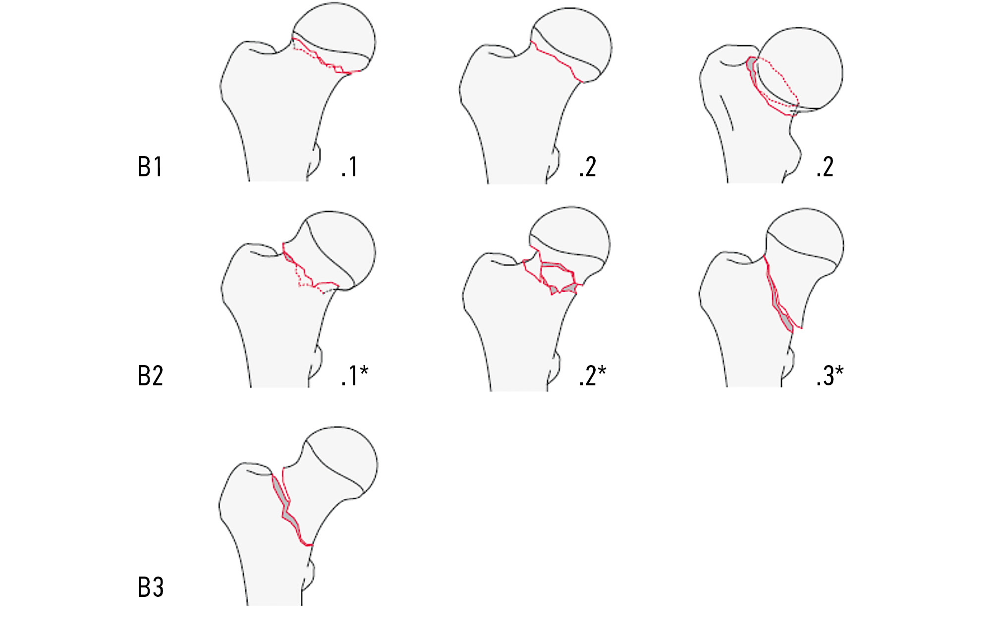 Согласно классификации АО/OTA, переломы ШБК имеют кодировку 31В и разделены на 3 типа — В1, В2, В3, которые, в свою очередь, в зависимости от тяжести перелома подразделяются на 3 подгруппы (рис. 4) [13]: