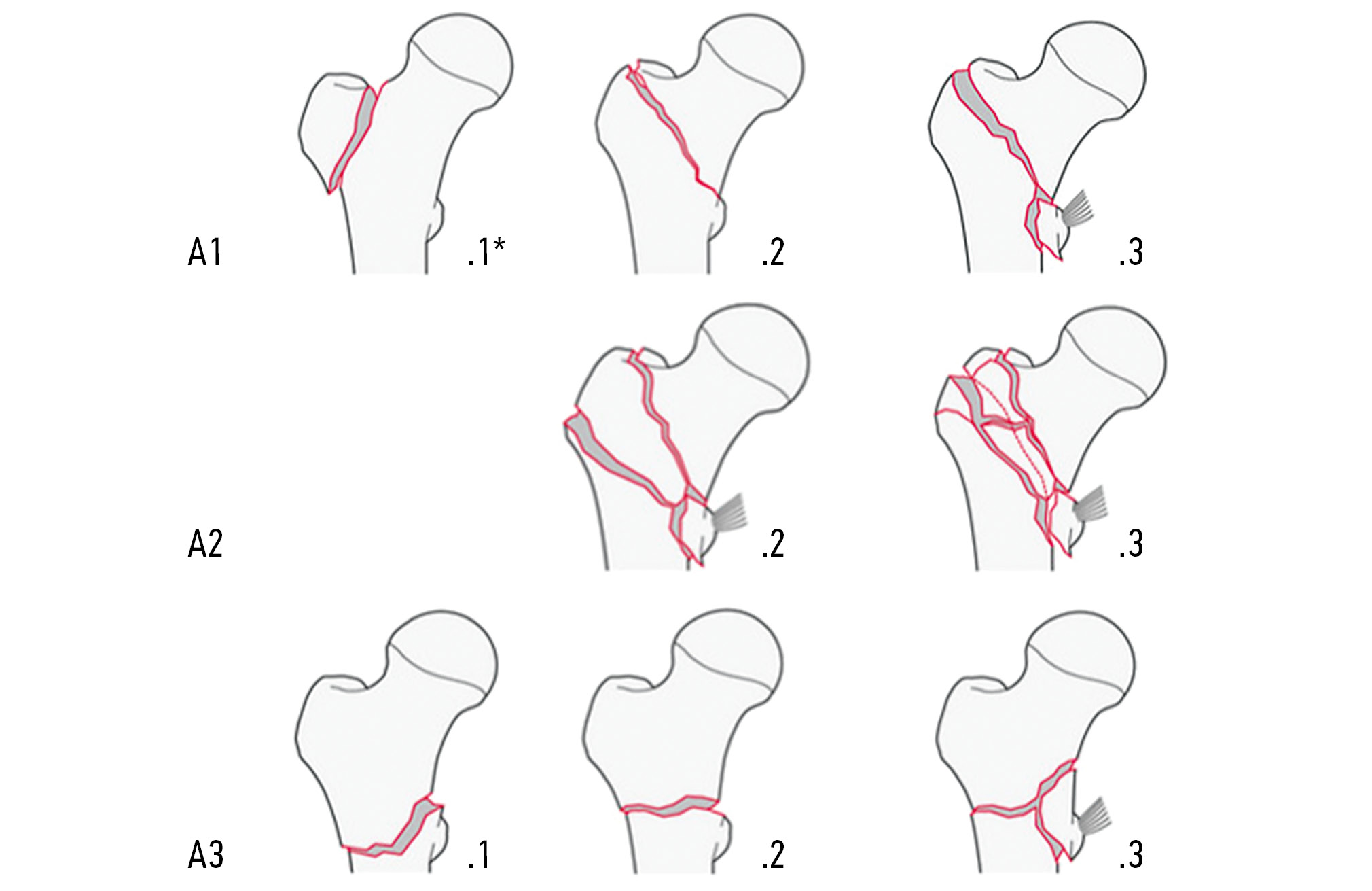 К внекапсульным переломам относят чрезвертельные, межвертельные и подвертельные переломы. Согласно классификации АО/OTA [13], чрезвертельные переломы имеют кодировку 31A и разделены на 3 типа — А1, А2, А3, которые, в свою очередь, в зависимости от тяжести перелома подразделяют на 3 подгруппы (рис. 5).