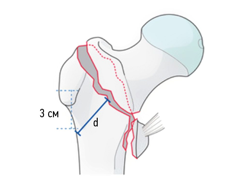 К подвертельным относятся переломы, локализующиеся в области между малым вертелом и линией, расположенной на 5 см ниже малого вертела, кодируются они по классификации АО/OTA как 32A/B/C (1-3).1 [13].