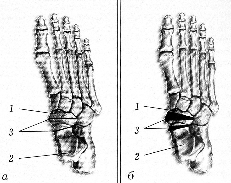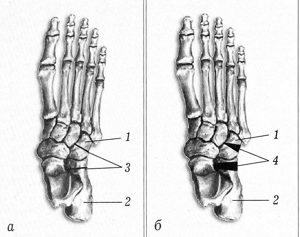 Рис. 1. Способ лечения плосковальгусной деформации стоп у детей: схема операции.а — соотношения в суставах стопы до операции, б — после операции (1 — кубовидная кость, 2 — пяточная кость, 3 — линия остеотомии, 4 — внедренные трансплантаты).
