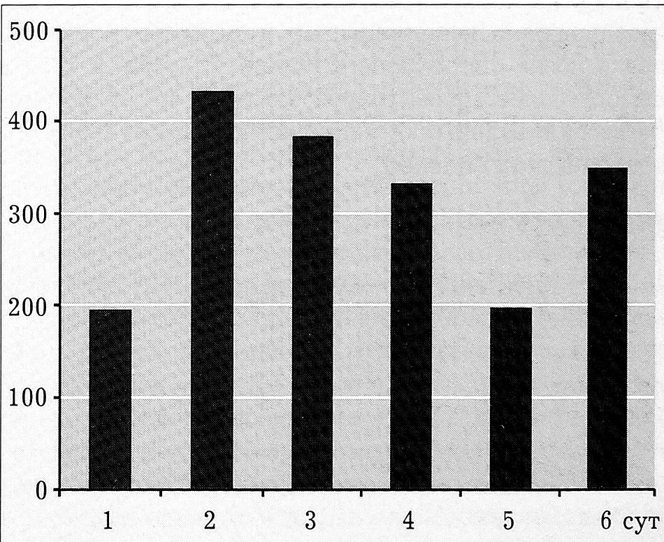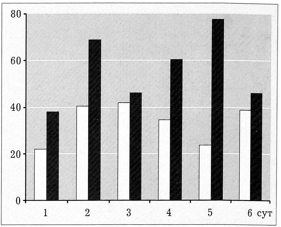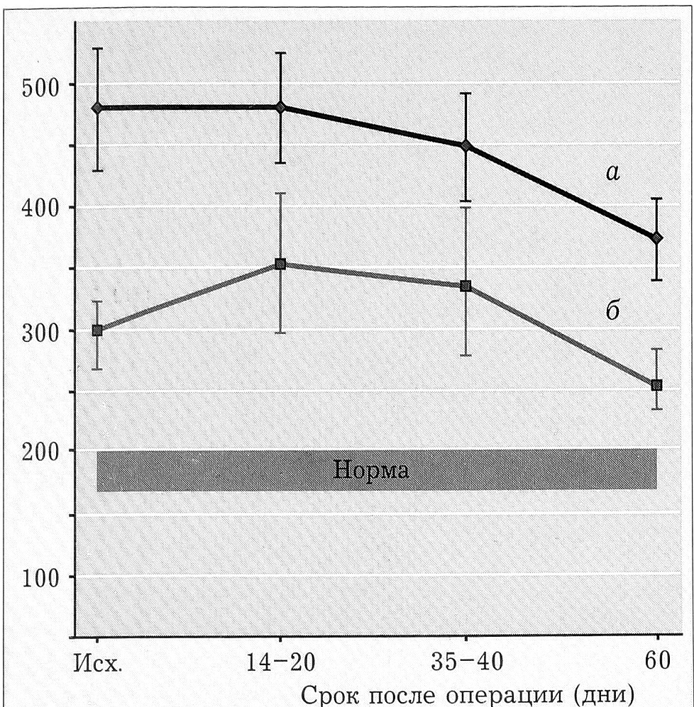 Рис. 3. Суточная экскреция с мочой оксипролина (в мкмоль/сут) у больных с остеомиелитом в разные сроки после оперативного лечения.a — обострение процесса; б — вялое течение.