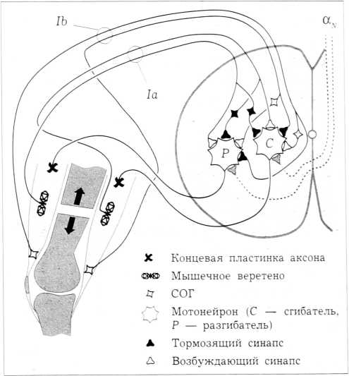 Рис. 1. Взаимодействия элементов нервно-мышечной системы на сегментарном уровне, развивающиеся при удлинении конечности. Іа — нервные волокна мышечных веретен, Іb — нервные волокна СОГ. αN— нисходящие аксональные связи.