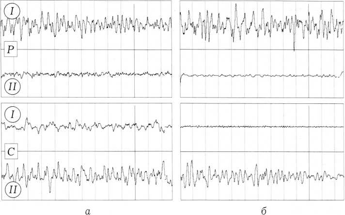 Рис. 2. Электромиограммы больного М. до (а) и после (б) БОС-терапии. I —активность разгибателей, II — сгибателей голени; Р — разгибание, С — сгибание голени.