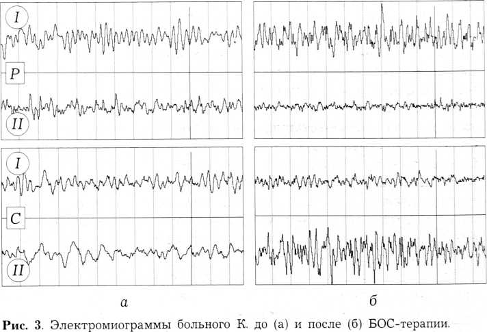 Рис. 3. Электромиограммы больного К., до (а) и после (б) БОС-терапии. I — активность разгибателей, II — сгибателей голени; Р —разгибание, С — сгибание голени.