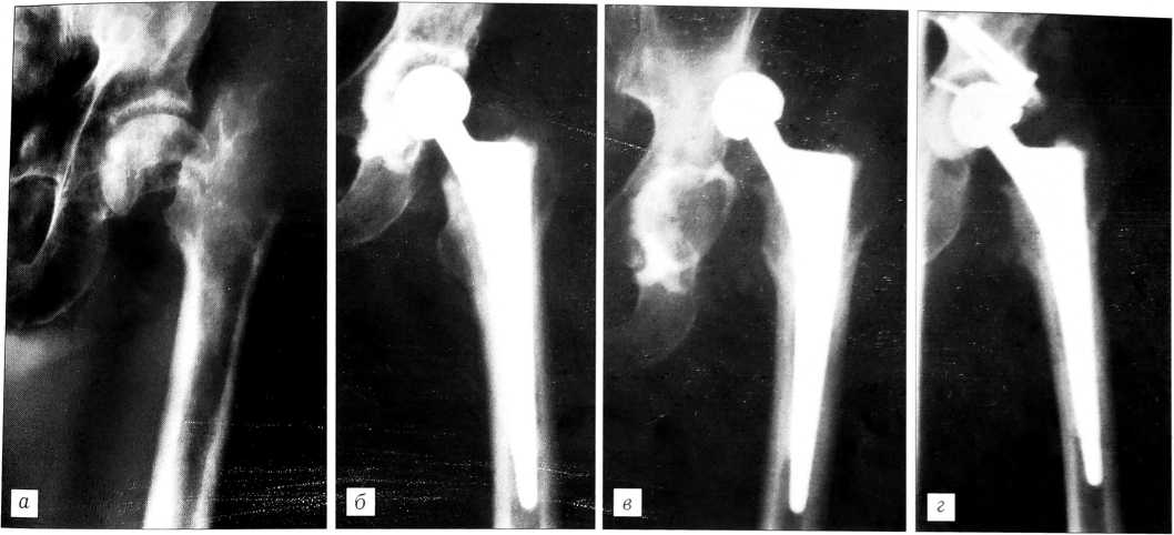 Рис. 1. Рентгенограммы больного П. а — до операции: медиальный перелом шейки левой бедренной кости; б — состояние после тотального эндопротезирования левого тазобедренного сустава протезом конструкции УкрНИИТО с фиксацией на костном цементе; в — вывих головки эндопротеза; г — состояние после ревизионного эндопротезирования левого тазобедренного сустава (фиксация ацетабулярного компонента на костном цементе с одновременным цементированием винтов, служащих препятствием для смещения чашки).