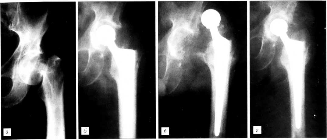 Рис. 2. Рентгенограммы больного Ф. а — до операции: ложный сустав шейки левой бедренной кости; б — состояние после тотального эндопротезирования левого тазобедренного сустава протезом конструкции УкрНИИТО с фиксацией на костном цементе; в — застарелый вывих головки эндопротеза. Обширные параартикулярные оссификаты; г — состояние после ревизии эндопротеза левого тазобедренного сустава (удалены гетеротопические параартикулярные оссификаты, головка протеза вправлена во впадину).